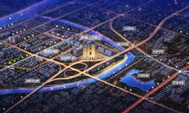 长城万富汇位于三一大道与东二环交汇的四方坪立交桥西北角,地铁3号线雅雀湖站,毗邻浏阳河,地理位置非常优越,景观资源非常丰富,特别是作为商务楼,其四周无遮挡,昭示性非常强,四面看江,非常有利于打造成北城区的地标级建筑。项目总建筑面积近10万㎡,由2层地下室、4层裙楼和双子座塔楼组成,总建筑高度100米。