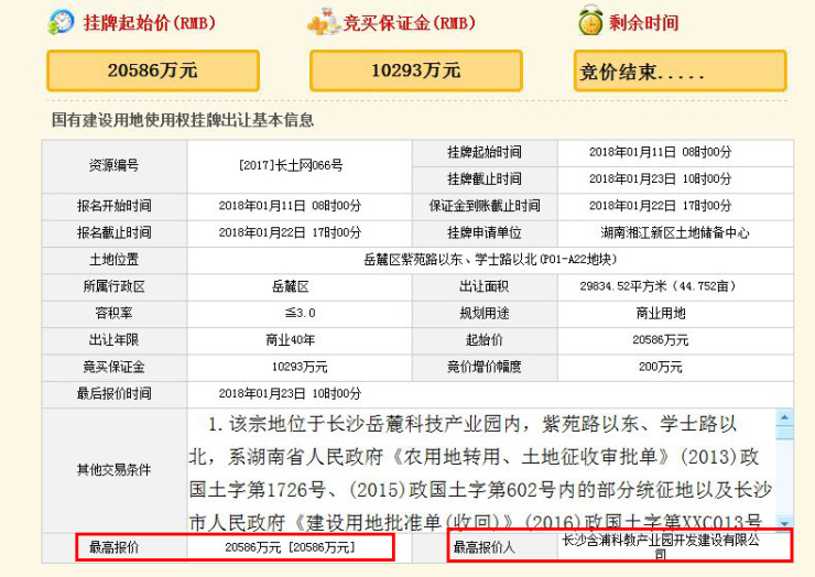 长土网066号宗地,最终由长沙含浦科教产业园开发建设有限公司以底价竞得。