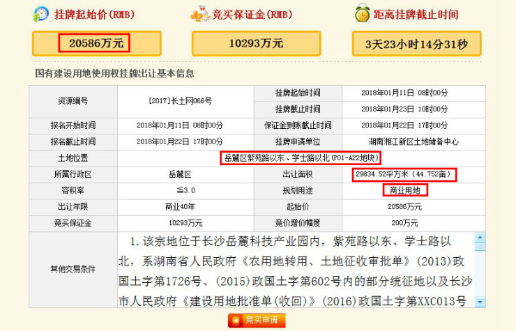 根据长沙市国土资源局土地交易系统发布数据,长土网066号宗地出让面积29834.52平方米,总建筑面积89503.56平方米,起始总价20586万元,起始楼面价约为2300元/平。