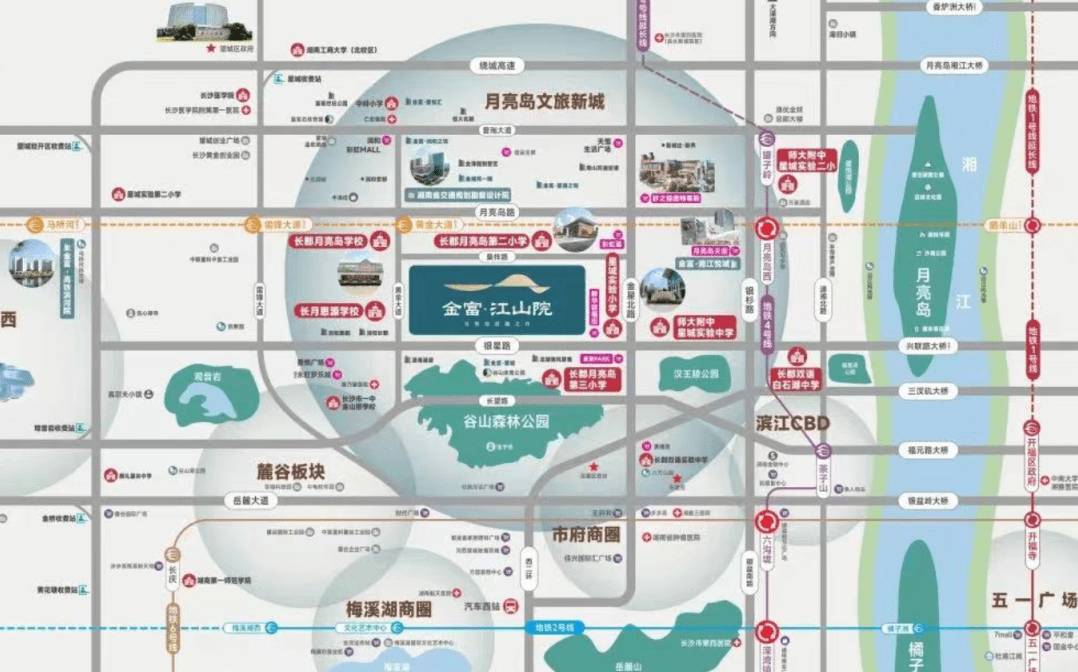 周边直线3km范围内有3个地铁站(罐子岭、月亮岛西、湘江新城),轨道交通发达,距离最近的地铁站是罐子岭。 周边直线1km内有20个公交站,距离最近的黄金路月亮岛路口站仅有217m,周边公共交通极为便捷。