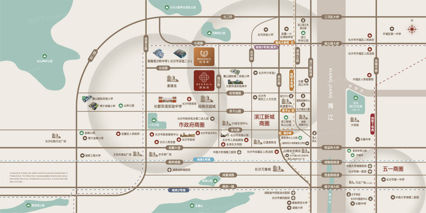 项目直线3km范围内有61个幼儿园;16个小学,如长沙市实验小学(北校区)、长沙市实验小学、麓山国际实验小学、长沙市岳麓区长茅岭小学、麓山国际第二实验小学等;5个中学:长郡双语实验中学、长郡滨江中学、长郡双语谷山实验中学、周南启明实验学校、湖南师范大学附属滨江学校。