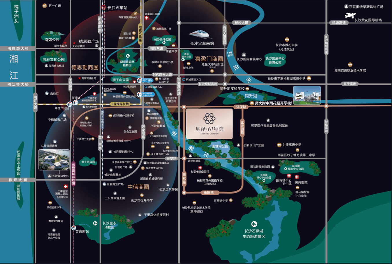 直线3km范围内有25个幼儿园;5个小学:砂子塘吉联第三小学、砂子塘嘉和小学、长郡雨花外国语第二附属小学、湖南省中小学、雨花区圭白路小学;3个中学:长郡雨花外国语洪塘学校、长沙市为盛高级中学、长沙市同升湖高级中学。