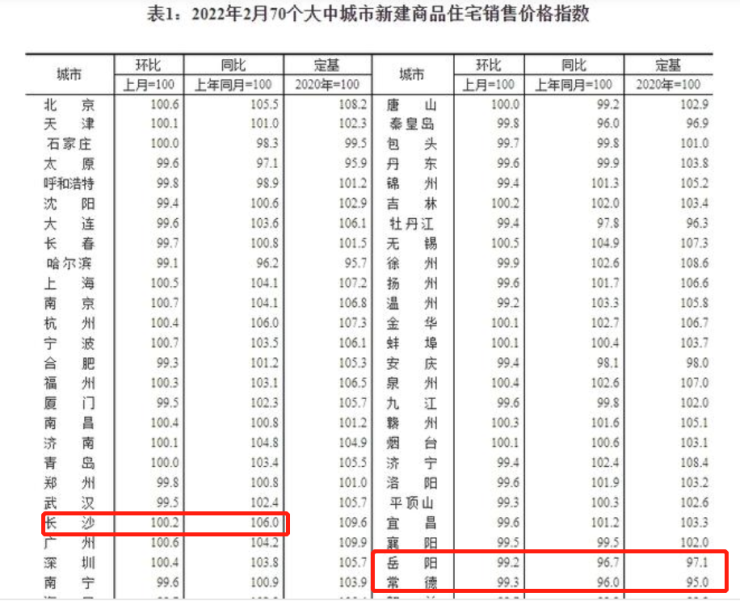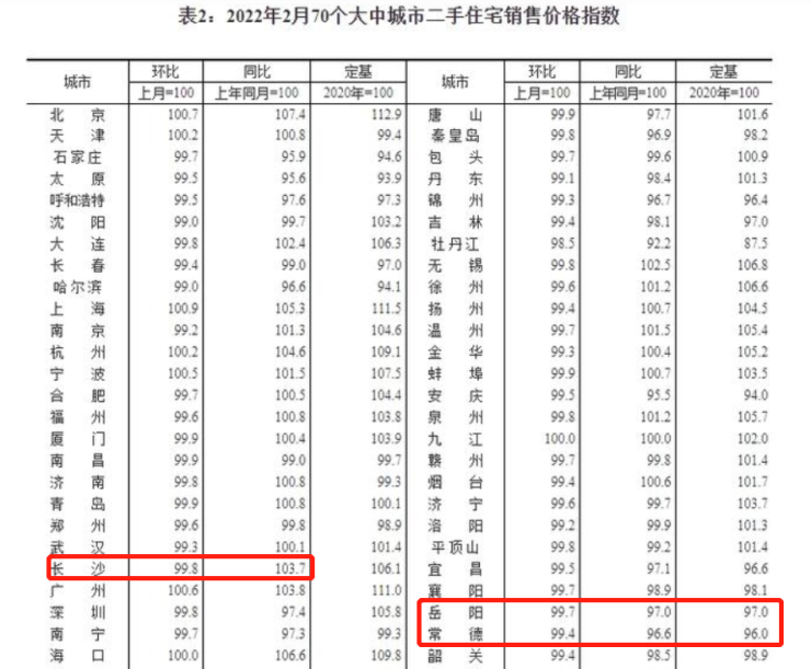 与此同时,根据2022年2月70个大中城市二手住宅销售价格指数,长沙二手房住宅环比下降0.2%,同比上涨3.7%。岳阳二手房价格环比下降0.3%,同比下降3%。常德二手房价格环比下降0.6%,同比下降3.4%。