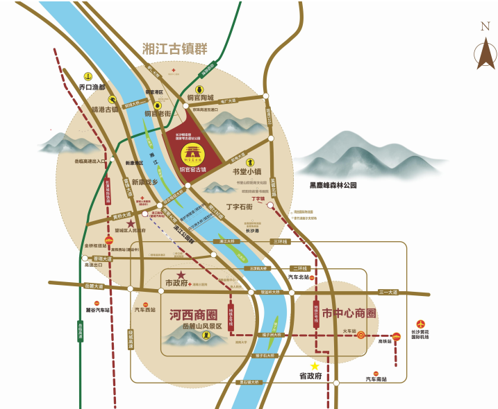 始于初唐盛于中晚唐的铜官窑,作为釉下多彩发源地,被誉为唐代“世界工厂”,享“南青北白长沙彩”之名,更在古镇群中雄踞醒目位置,可堪长沙“北端桥头堡”。向北辐射影响湘阴区域,向南衔接长沙金霞副中心,向西牵引湘江新区望城片区,优越的地理区位,尽享政策、人流、交通等多重红利。