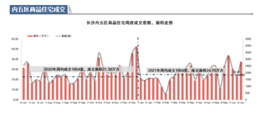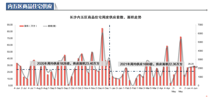 据湖南中原研究院数据显示,6月第4周供应端货量充足,整体增速趋于平稳。内五区一手住宅供应2268套,供应面积29.29万方,环比分别上涨6%、4%。