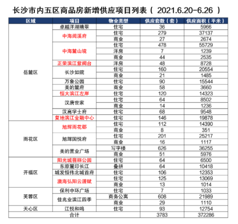 近一周内五区共计有21个商品房项目拿证,新增供应总量37.22万方,其中住宅体量占比79%,岳麓区项目占据半壁江山,开福、雨花紧随其后。中海阅溪府、中海麓山境、正荣滨江紫阙台、恒大滨江左岸、复地滨江金融中心、旭辉雨花郡、阳光城翡丽公园、澳海弘阳云潇赋八个项目待入市,另有美的置业广场写字楼、佳兆业滨江四季商务公寓等项目商业拿证。
