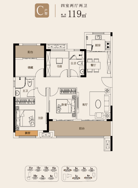 建面约119㎡户型可做四房,阳台甚至达到约6.8米宽。不得不说,这个户型的空间利用率,完全超越市面上同产品段户型,甚至于可同市面上125㎡以上户型正面PK!