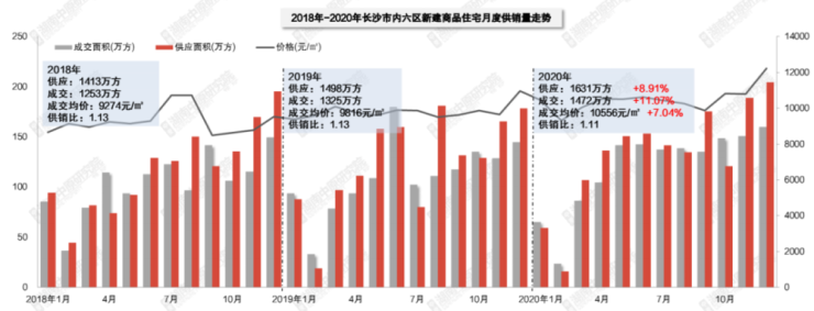 与此同时,2020年长沙楼市的新房成交各项数据也实现了“逆风翻盘”。湖南中原研究院的数据显示,2020年长沙内六区新建商品住宅供应1631万方,同比增长8.91%;成交1472万方,同比增长11.07%。供销比1.11,市场供需关系健康。其中高铁新城、麓谷谷山等板块成交去化表现亮眼,成交均破百万方,其次为含浦洋湖垸、雷锋两大板块。