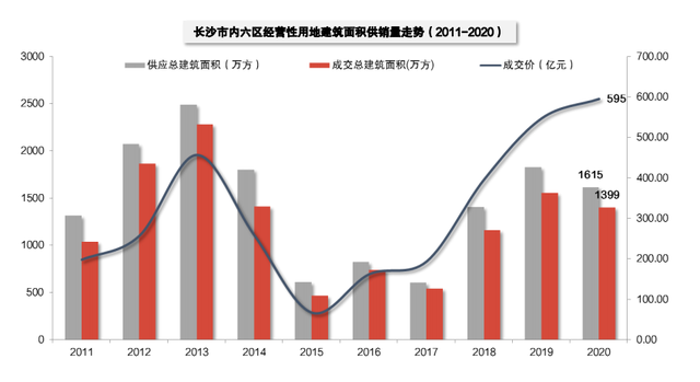 2020年,品牌房企对长沙的城市价值认可度上扬,投资开发拿地意愿强烈。长沙土地市场上,限价地频频熔断、摇号,地价上升明显。根据湖南中原指数研究院的统计,去年长沙内六区土地供应建面1615万方,成交1399万方,土地出让金达595亿元,创近十年新高。