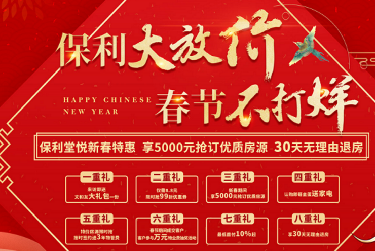 保利湖南推出“保利大放价、春节打烊”优惠促销活动。位于秀峰山脚下的保利·堂悦主推105-141㎡山居住宅,新春带来重磅特惠,8字头可抢购优质限量房源,更有5000抢订房源、较低首付10%起、限量赠送三年物管费、30天享无理由退房等八重惊喜好礼。位于麓谷片区的保利恒伟·时光印象主推119-139㎡住宅,春节期间购房,可享受来访送文和友大礼包、认购砸金蛋送家电、8.8元抢5000元物管抵扣费等多重好礼。