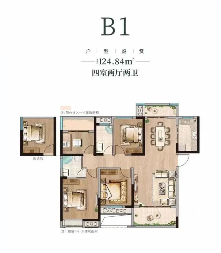 建筑面积约124.84m²的四室两厅两卫,U型厨房,南北双阳台,美景雅致各有所乐。另一个北向阳台可与室内打通,从空间的释放到生活功能性需求,赋载理想人生无限可能。