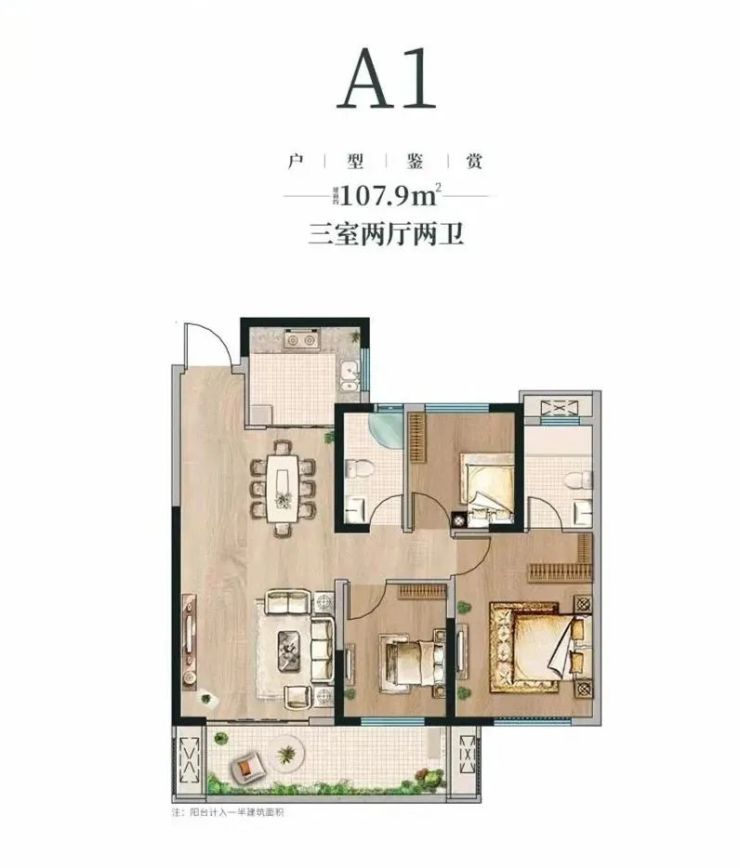建筑面积约107.9m²的三室两厅两卫,南北通透,餐客厅一体化,更有约6.4m全朝南的大阳台设计,IMAX观景视野,保证空间的充沛采光,真切感受居住魅力。