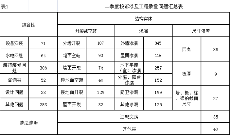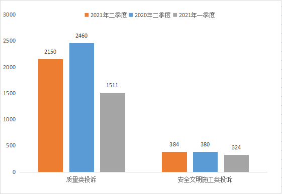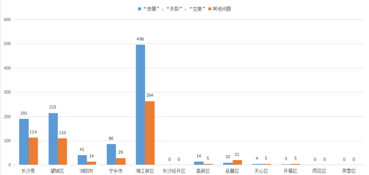 《通报》显示,二季度长沙受理各类投诉共2534起,接待投诉咨询电话或来访市民951余人次,包含工程质量类投诉2150起、安全文明施工类投诉384起。其中,渗漏、开裂、空鼓类问题投诉占涉及工程质量投诉总量的52.89%,尤以渗漏问题最为突出,特别是房屋外墙部位及地下室工程。其次便是综合类问题占比较大,占总投诉量28.3%,如窗户或玻璃问题、外墙瓷砖掉落问题、交付与合同不一等。就区域而言,湘江新区、望城区、长沙县是此类问题高发区域,也是今后亟待加强管控的重点区域。