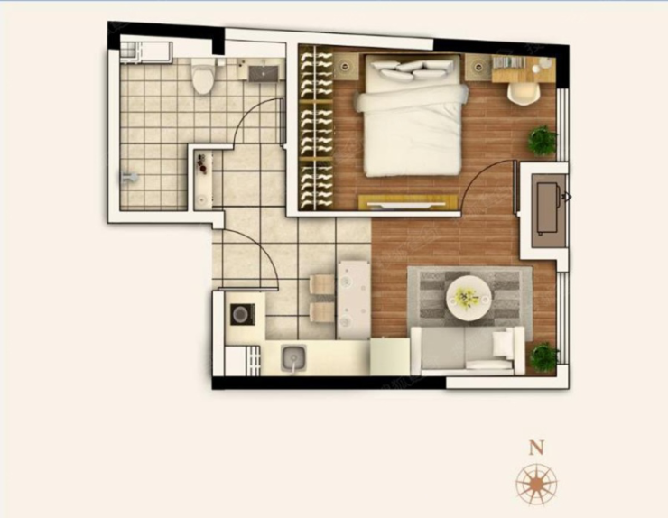 简评:54平的正一室一厅,布局科学,卫生间干湿分离,保证洁净有序。客厅结构紧凑,空间不浪费。