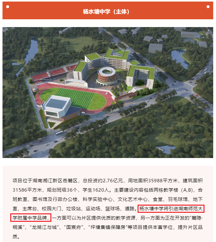 早前招标文件公示,杨水塘中学项目总投资约2.76亿元,用地面积35988平方米,建筑面积31586平方米,规划36班,可容纳学生1800人,预计2023年秋季开学。