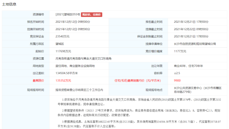 其中体量较大的055号地块,在首轮土拍中无人竞价,惨遭流拍。该地块曾是新华联二期地块,早前有不少严苛的拿地条件,例如负责长郡月亮岛二小的扩建、建一定的商业、引进一个区域总部等。在经历流拍再挂牌后,可以看到大多条件都已取消,仅规定商住比2:8,容积率≤2.5,毛坯限价9900元/㎡,也是望城14宗地块中的较高限价地。