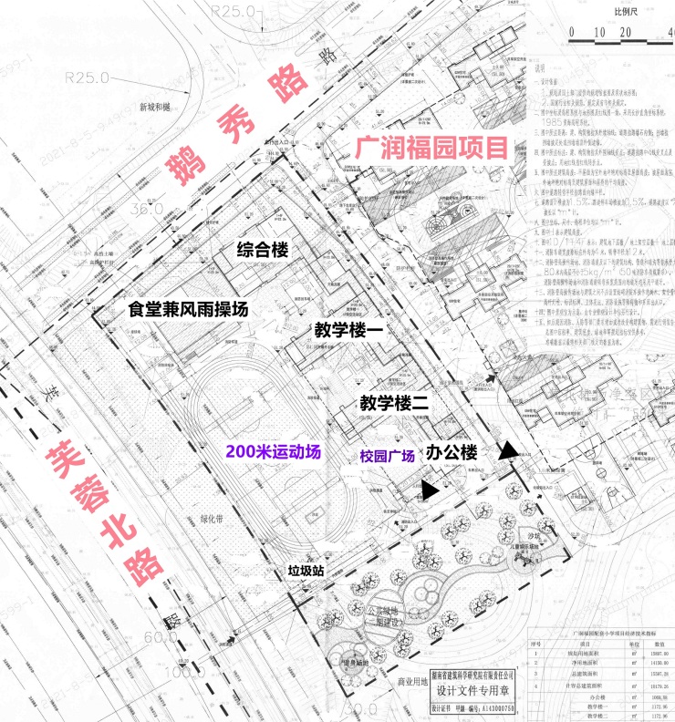 根据规划信息,学校规划用地面积15897㎡,净用地面积14150㎡,占地面积3352㎡,总建面15597.28㎡,包括1栋办公楼、2栋教学楼(共18个班)、1栋综合楼,另带有食堂兼风雨操场、200米运动场、校园广场等配套。地下停车位共45个,主出入口位于东侧,紧邻广润福园。