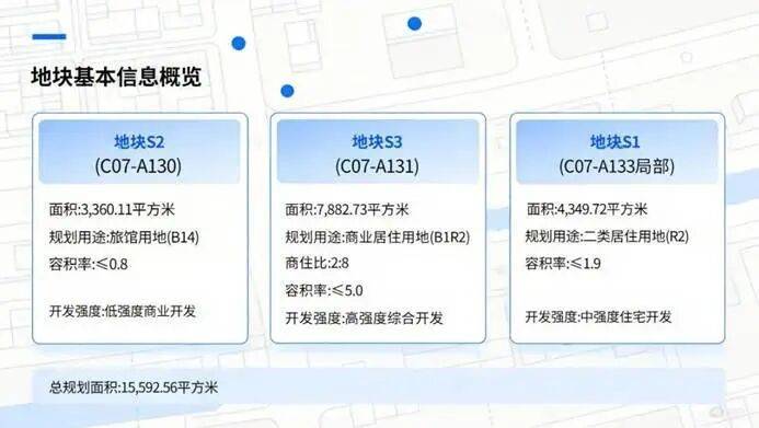 该地块分为C07-A130、C07-A131、C07-A133(局部)三宗小地块,规划用途为旅馆用地(B14)、商业居住用地(B1R2,商住比2:8)、二类居住用地(R2)。出让年限为商业用地40年,住宅用地70年。