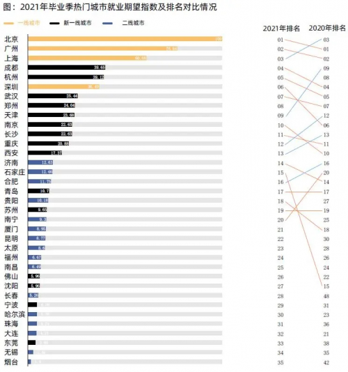 报告显示,凭借优质的资源及产业基础,北京、广州、上海等一线城市仍是毕业生的优选就业城市。不过,深圳从2020年的第四调整为2021年的第六,主要原因之一就是居住负担相对较高,对人才吸引形成消极影响。