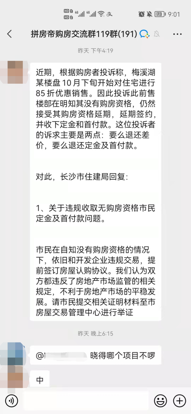 近日,拼房帝购房交流群内也有粉丝讨论梅溪湖某楼盘85折销售的事件,投诉者的主要诉求有两点:退还差价,或者退还定金及首付款。