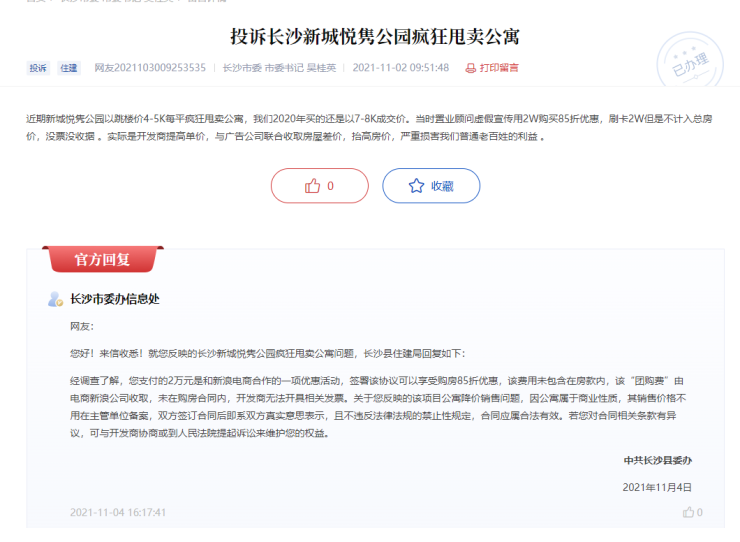 11月2日,问政湖南上出现一则投诉,新城悦隽公园去年7-8k每平的公寓,现在以跳楼价4-5K每平疯狂甩卖,业主们质疑开发商提高单价,与广告公司联合收取房屋差价,抬高房价,严重损害了业主们的利益。