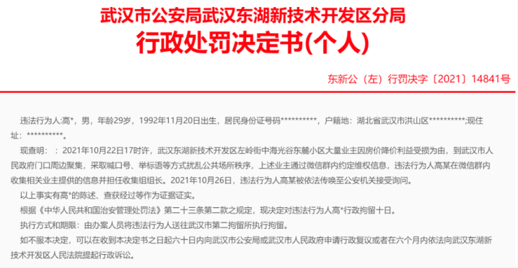 据湖北公安执法公开平台消息,近期,在武汉东湖新技术开发区左岭街中海光谷东麓小区的多名业主由于扰乱公共场所秩序,被警方给予行政处罚,多人被予以行政拘留。今年多地出现业主们的“降价维权”,首次得到了强硬回应。