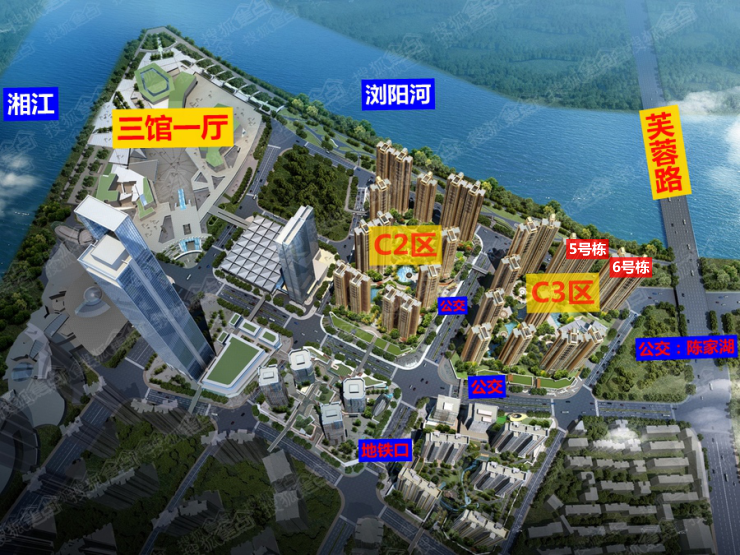 北面有浏阳河,西面有湘江、新河三角洲,三馆一厅由政府花七年时间打造。涵括长沙音乐厅、博物馆、图书馆、城市规划展示馆,均已全部运营。据悉,长沙市政府规划从浏阳河两岸间修一座桥,连接对面的湘江世纪城,以后人气会比较旺。