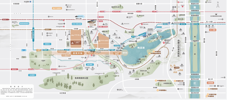 交通配套方面,项目直线距离500米内有双地铁口,距离2、6号线双地铁口省图书新馆站(在建)仅约500米,距离2号线百合路站(在建)约350米。搭配梅溪湖二期纵横交错的路网及交通规划,项目无论公共交通及自驾出行都十分便捷。
