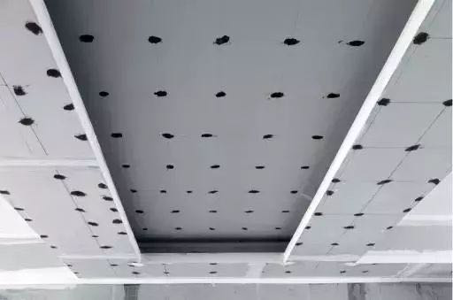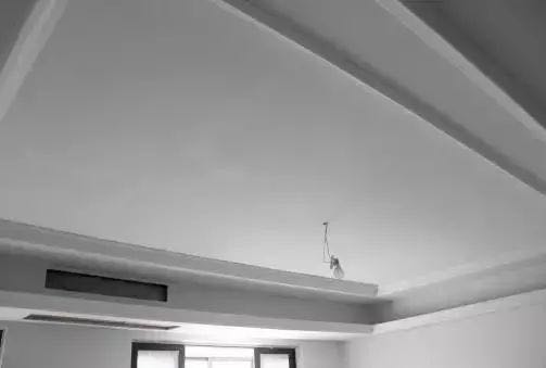 石膏板吊顶固定,全部采用弹线后黑螺丝固定,禁止用枪钉固定,以防后期乳胶漆施工导致钉眼生锈。