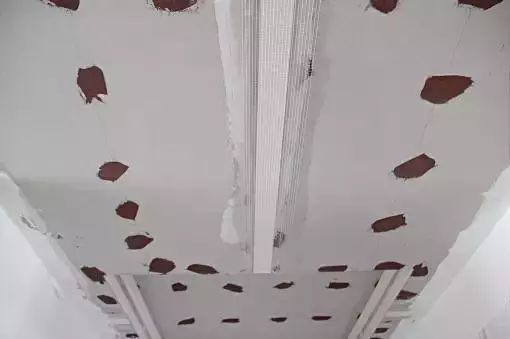 为防止石膏板拼接处开裂,在原有工艺的基础上,在贴一层网格布,确保后期乳胶漆不会开裂。