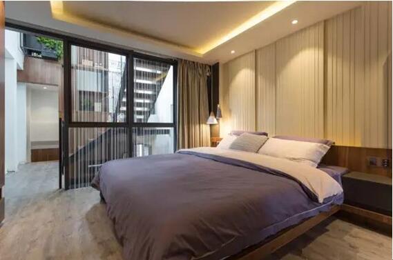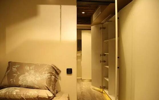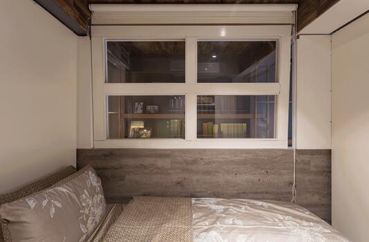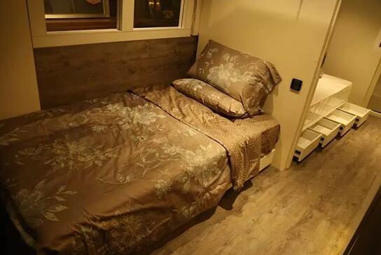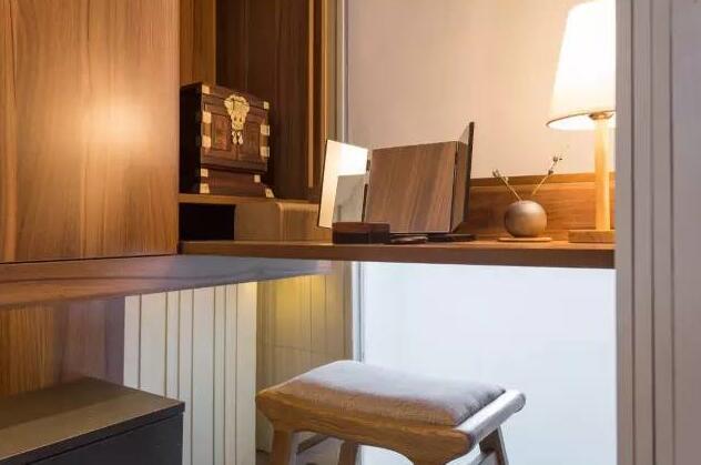 女儿与女婿一改以往的“小黑屋”,通过挑空与简约原木家具设计,让房间整体更简单、更透亮。衣柜转角挖出一个组合书桌柜,满足女儿梳化需求以及女婿紧急办公需求。