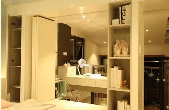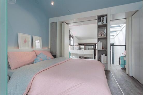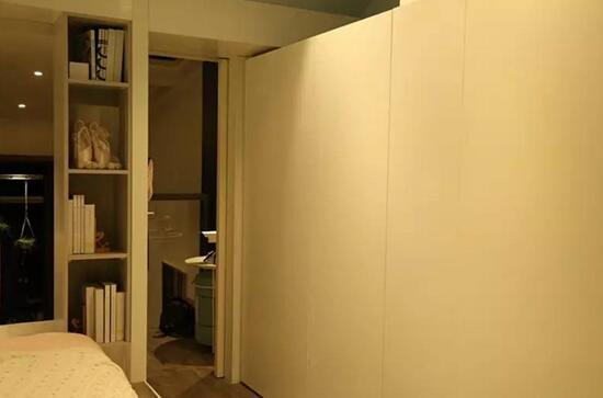拉开隔门,就能看到一体化的洁白书柜,让小孩轻松玩耍之余开心学习知识。
