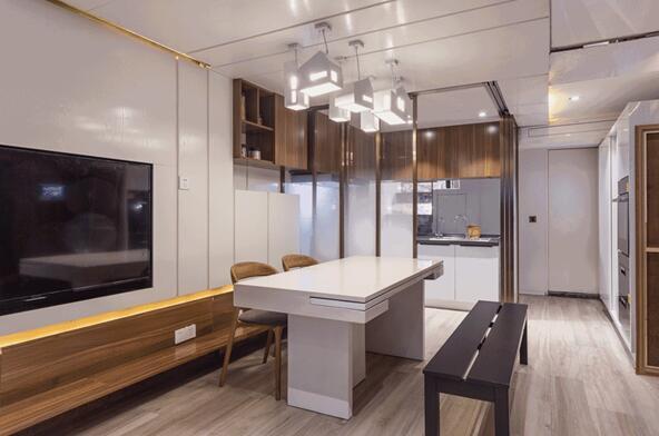 开放式餐厅整合了客厅饭厅厨房的整厅概念,可通过灵活的间隔,与伸缩组合家具,可变成满足多人使用的餐厅,可变成多人聚会的客厅。连女儿都抢着要煮早餐呢!