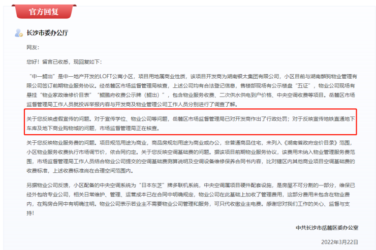 ·对于宣传学W、物业公司等问题,岳麓区市场监督管理局已对开发商作出了行政处罚;