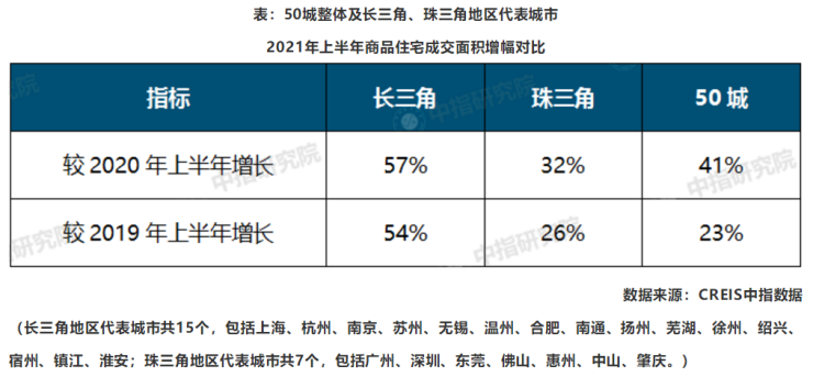 据中指数据初步统计,2021年上半年,50个代表城市商品住宅月均成交面积约3580万平方米,达近五年较高。长三角地区代表城市延续火热势头,商品住宅成交面积同比增长57%,较2019年上半年增长54%。珠三角地区的广州、深圳等城市市场活跃度较高,商品住宅成交面积分别同比增长89%和55%。