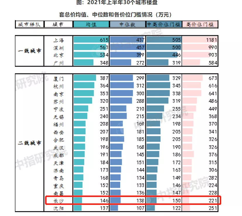 长沙的套均总价均值为146万元、套均总价中位数为138万元,在二线城市中仍处于较低位置。与此同时,来自湖南世联行数据显示:今年上半年,长沙内五区普通住宅成交均价为12450元/㎡,同比2019、2020年上半年同期的新房价格,分别上涨了17%、9%。