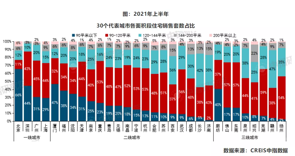从中指院监控的重点城市来看,市场主流需求仍聚焦90-120平方米产品,多数城市该面积段成交套数占比提升。与2020年相比,30个代表城市中有13个城市90平方米以下成交套数占比有所提升。