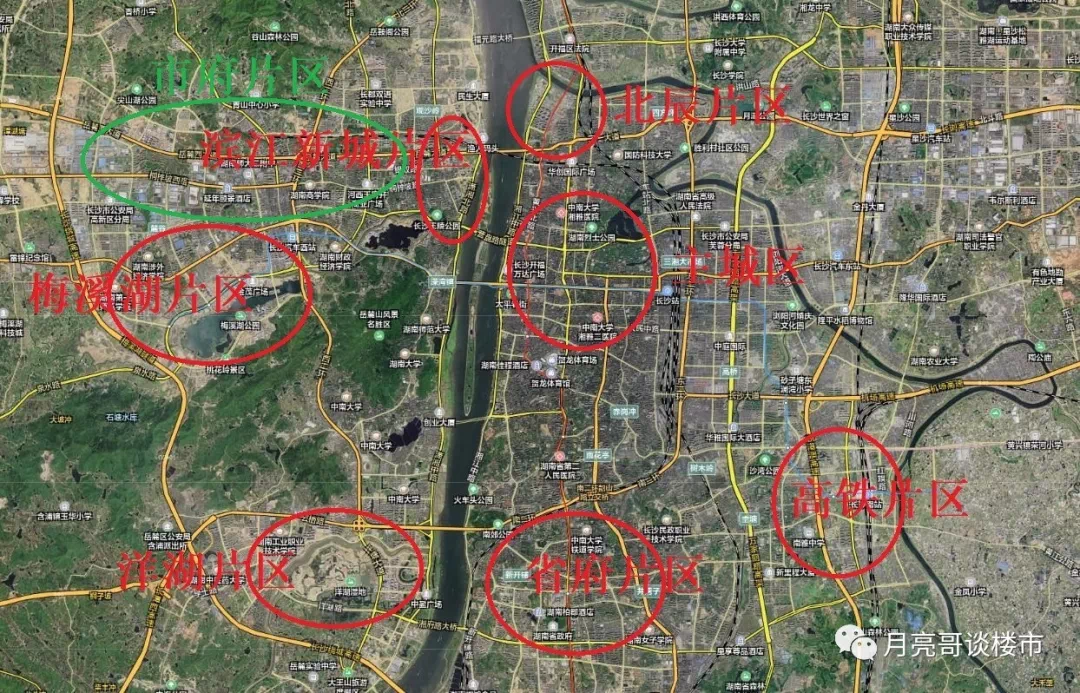 梅溪湖片区是新区有政策、商业综合体、名校加持,但关键在于它无法比拟湘江,所以未来成交价会低于北辰片区、滨江新城片区。