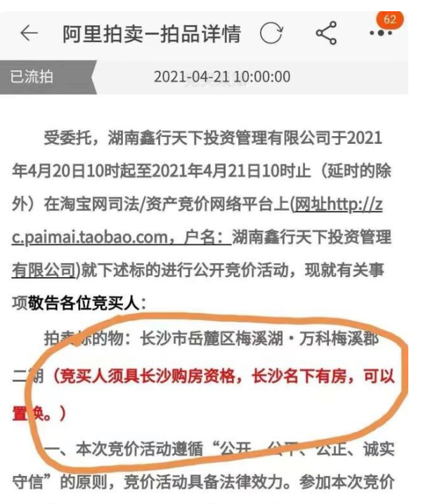 自今年以来,北京杭州、上海等城市陆续出台针对法拍房的相应政策,堵住法拍房的“口子”。今年4月起,长沙也给部分法拍房套上“限购紧箍咒”。4月21日,梅溪湖片区的万科梅溪郡二期一套法拍房便已明确要求竞买人须具长沙购房资格。