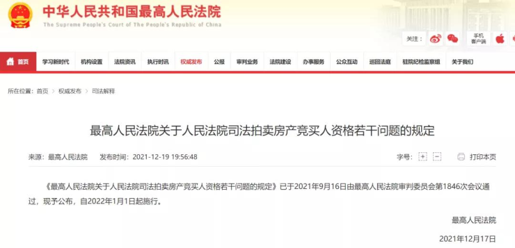 根据《规定》,人民法院组织的司法拍卖房产活动,受房产所在地限购政策约束的竞买人申请参与竞拍的,人民法院不予准许。与此同时,《规定》还明确指出:竞买人申请参与竞拍的,应当承诺其具备购房资格并自愿承担法律后果;人民法院在法拍房成交后,向买受人出具成交裁定书前,应当审核买受人提交的具备购房资格的证明材料。这一《规定》将于明年1月1日起实施,“法拍房不限购”将正式成为“过去时”。