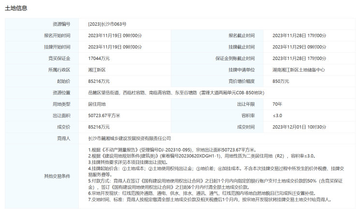 然而,这块地的"前世"并不简单。追溯至2023年11月23日,该地块曾以【2023】长沙市063号的编号,由“麓山城投”底价竞得。