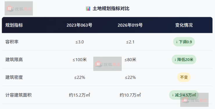 容积率从原3.0下调至2.1,建筑限高从100米下调至80米,计容建面从15.2万㎡下调至10.7万㎡。