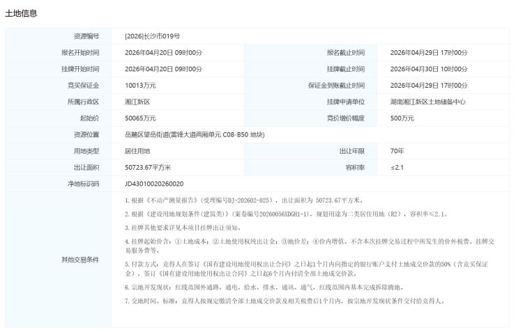 长沙市岳麓区谷山板块再次迎来土地挂牌。编号【2026】长沙市019号地块,位于雷锋大道两厢单元C08-B50地块,4月正式挂牌亮相。