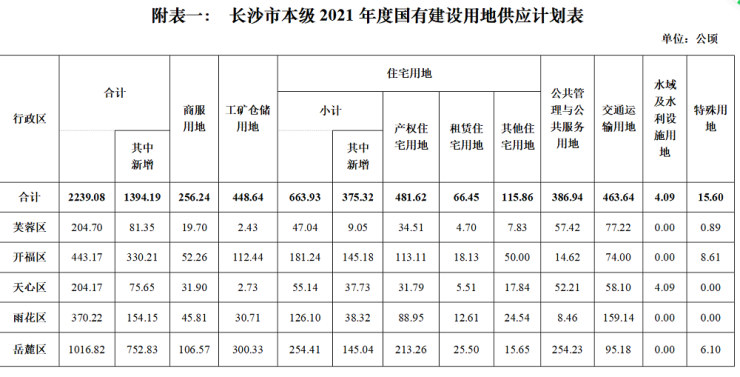 日前,长沙市自然资源和规划局发布《长沙市本级2021年度国有建设用地储备和供应计划》。长沙市本级(内五区)2021年度国有建设用地供应总量为2239.08公顷,其中占比较大的为住宅用地,计划供应面积为663.93公顷,占总规模的29.65%。