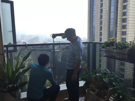测量阳台玻璃护栏高度,数据显示护栏净高1.3米,记者 卜岚 摄
