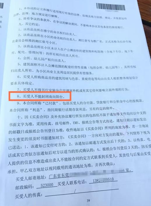 合同内约定“南向阳台不能封闭”。记者 卜岚 摄