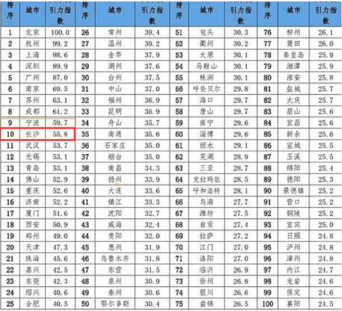 “人才是排名前列资源”。在新时期城市抢位战之中,人口都是各城市首当其中的抢滩资源,大量人口的涌入也使得大城市形成了盆地聚集效应,为城市提供源源不断的发展活力。5月14日,泽平宏观和智联招聘联合推出的《中国城市人才吸引力排名:2021》显示,中国较具人才吸引力城市100强排行榜中,长沙位居TOP10。