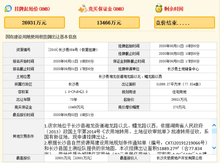 9月1日,保利以31.93亿竞得洋湖地块。今日,保利在长沙“金九”土拍战中再下一城。恢复挂牌的[2019]长沙县084号地块吸引了22轮竞价,最终被长沙天骄房地产开发有限公司以32601万元的价格摘得。据查,该公司为保利湖南投资有限公司全资控股。