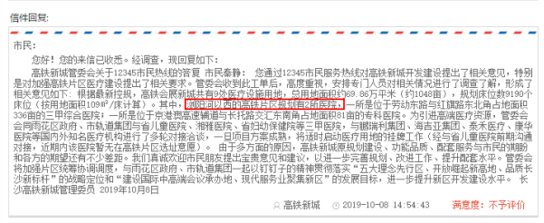 虽然早在2016年长沙市政府下发《长沙市区域卫生规划(2015-2020)》,就已明确在新建区域按30万人口以上规划设置一所三级综合医院,但迟迟不见动静。这不,最近就有热心市民在市场信箱中就武广医院问题进行提问。