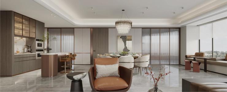 创新LDKB“无界生活厅”,将客厅、餐厅、厨房、阳台打造为一体化公共系统,保证各功能区域独立又共享。空间的开放创造了无遮挡的生活视野,连接家庭不同角色在不同行为中的视线,满足亲情陪伴的同时,还为主人量身打造了里子和面子兼具的“会客排场”。